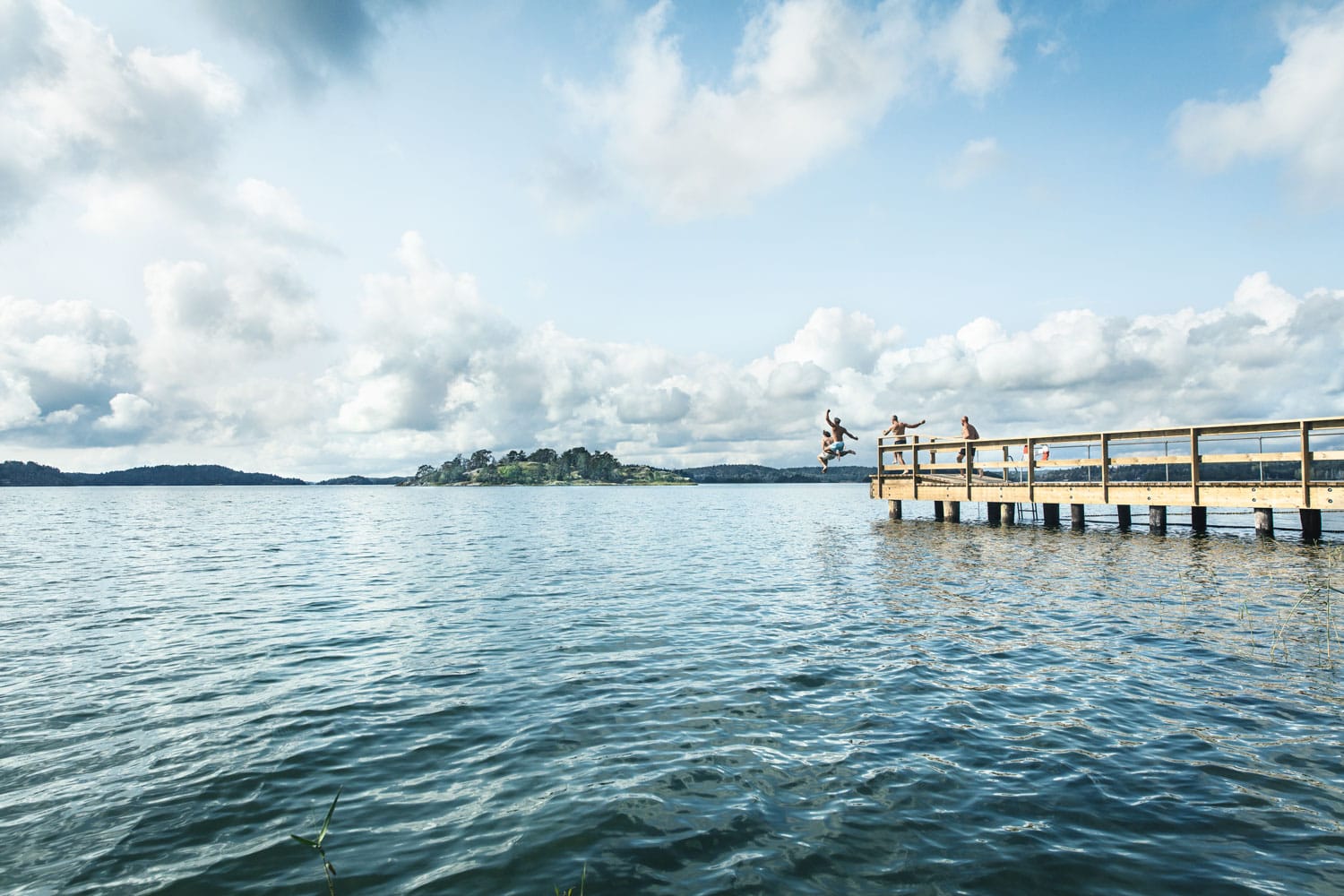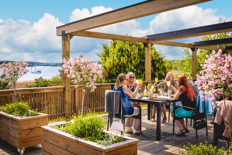 På eftermiddagen serveras rosébubbel och snittar på vår havsterrass. Passa på att njuta av den fria utsikten över Hårsfjärden.